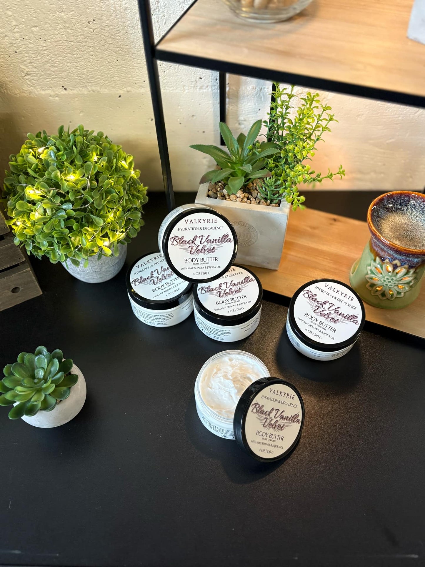 Indulge your skin AND your senses with our EXTRA hydrating & decadent Black Vanilla Velvet body butter. Featuring kokum butter, macadamia and jojoba oil, the creamy, velvety texture glides on effortlessly, enveloping you in luxurious buttered-bliss. The perfect treat for your skin, our body butter is a must-have for a truly indulgent and delicious self-care experience!